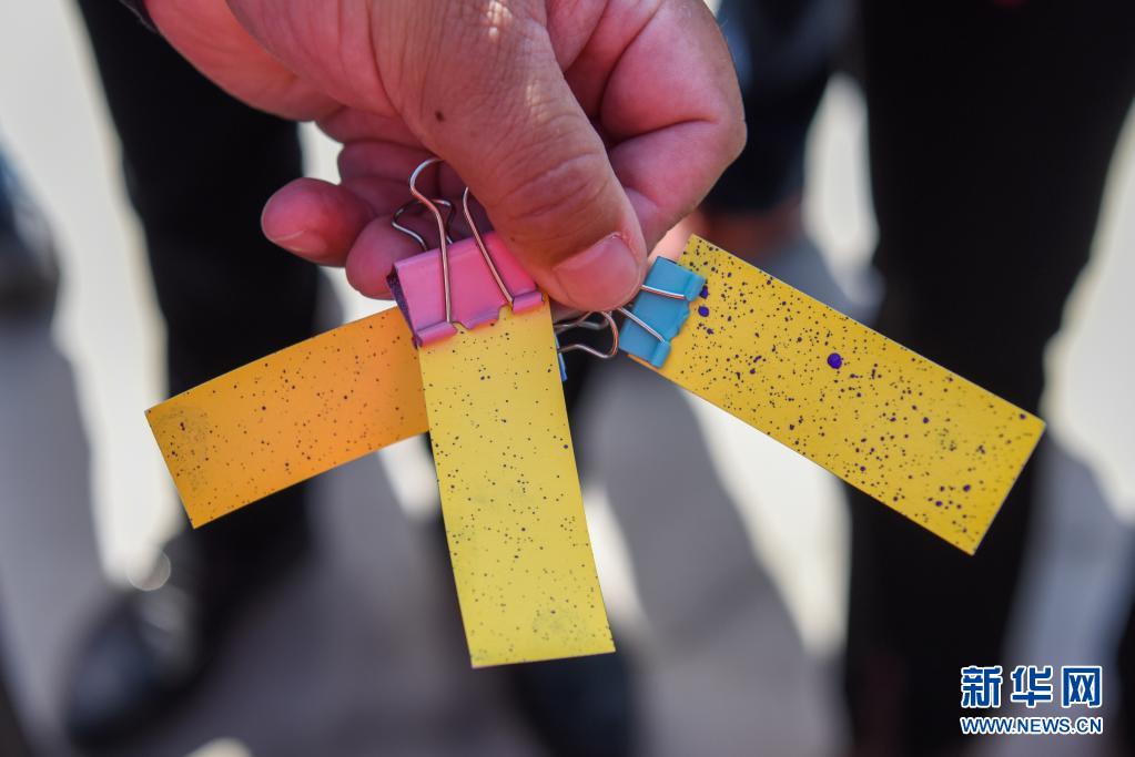4月11日,在鐵門關市一處香梨示范園,技術人員檢驗植保無人機花粉噴施效果。新華社記者 丁磊 攝