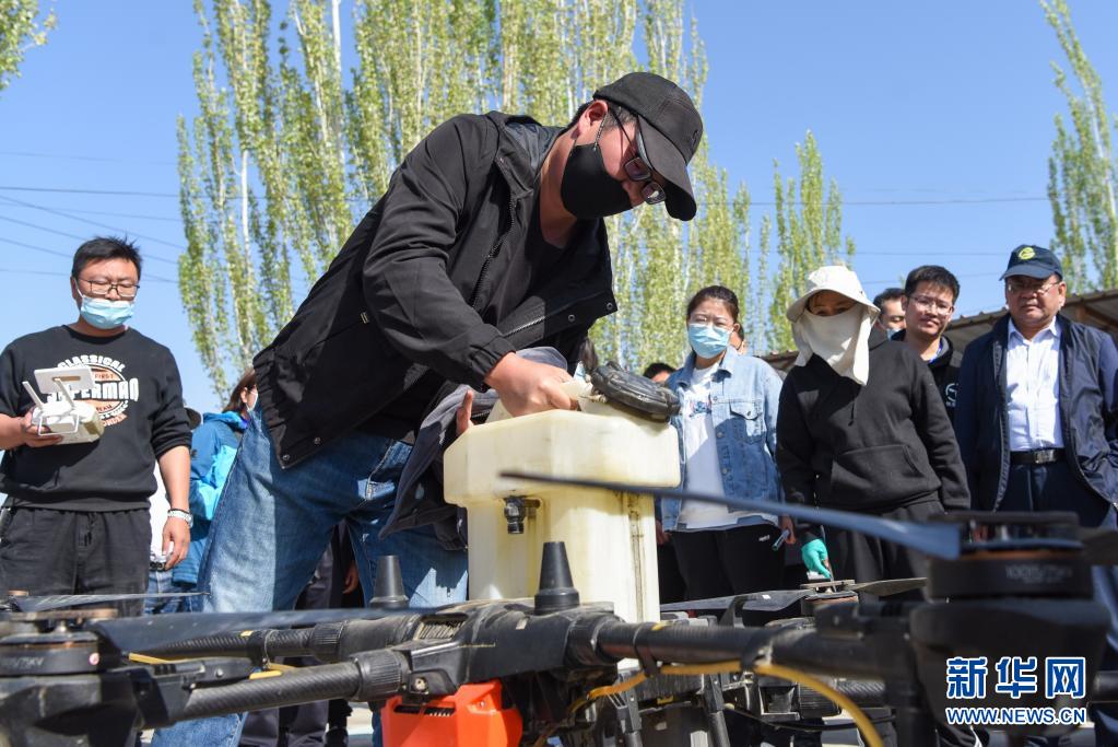 4月11日,在鐵門關市一處香梨示范園,技術人員將配制好的花粉稀釋液裝入植保無人機。新華社記者 丁磊 攝