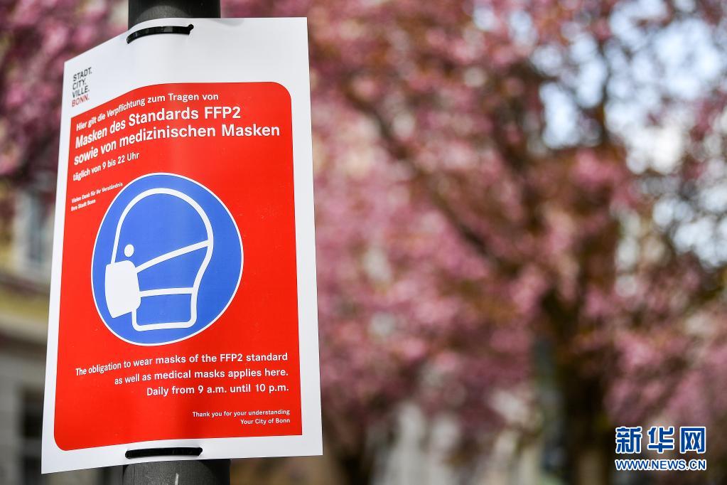 4月13日,德國波恩老城區(qū)的櫻花樹下張貼著提示游人佩戴醫(yī)用口罩的標(biāo)識(shí)。