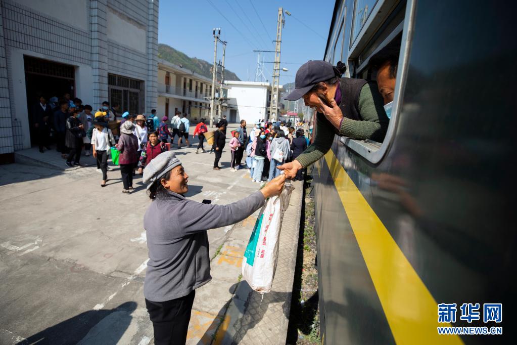 5633次列車停靠小站,彝族乘客與等候在月臺(tái)上的小商販通過(guò)車窗交易(4月11日攝)。新華社記者 沈伯韓 攝