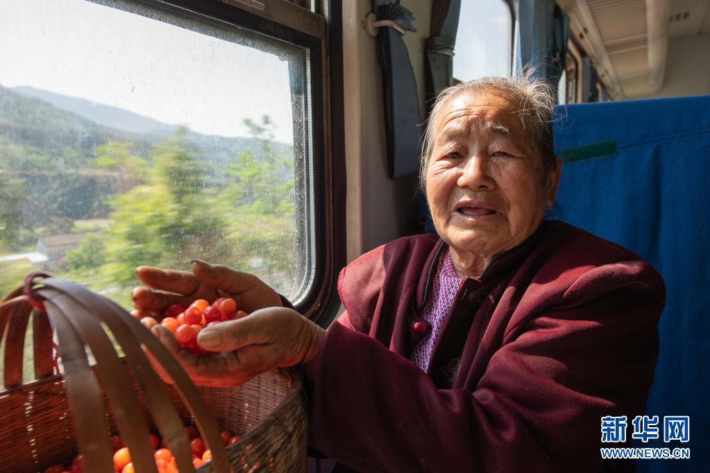 冕寧縣村民馬光玉帶著自家種的櫻桃前往西昌出售,每天她都會(huì)搭乘5633/5634次列車往返西昌和冕寧(4月11日攝)。新華社記者 胥冰潔 攝