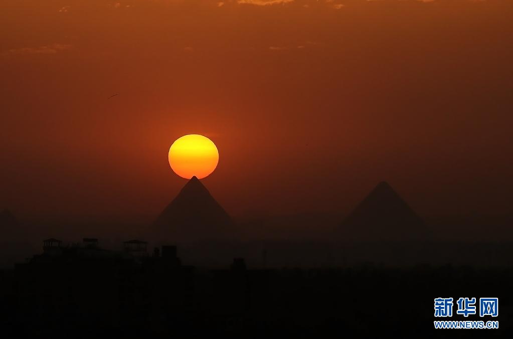 這是4月14日從埃及開羅拍攝的吉薩金字塔群日落景色。新華社記者 王東震 攝
