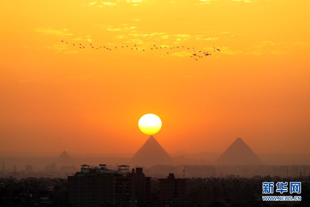 這是4月14日從埃及開羅拍攝的吉薩金字塔群日落景色。新華社記者 隋先凱 攝
