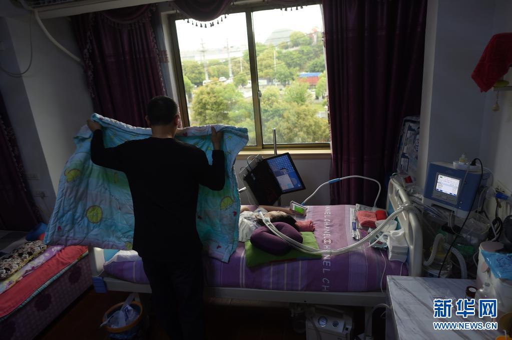 父親包宗鋒為包珍妮蓋被子(4月14日攝)。