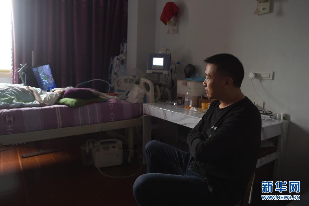 父親包宗鋒坐在床邊隨時“待命”(4月13日攝)。包宗鋒被檢查出腦血管畸形,因為要照看孩子,一直不敢去做手術。