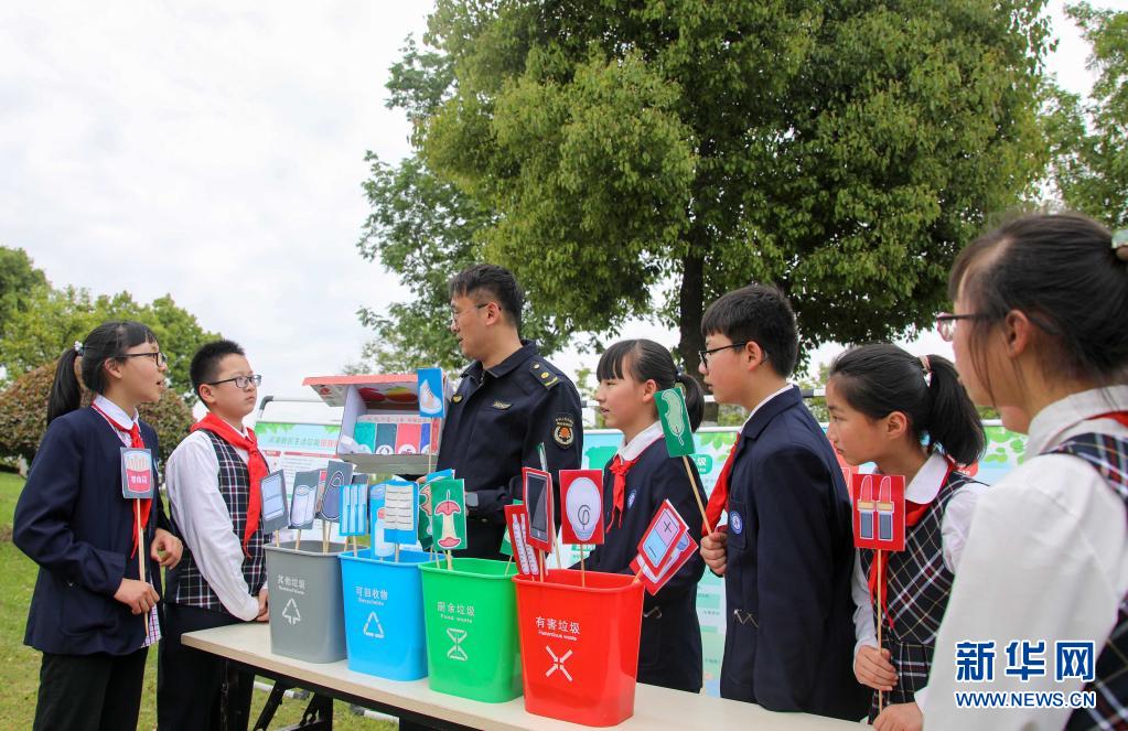 4月19日,工作人員向?qū)W生們講解垃圾分類、資源回收利用等常識(shí)。