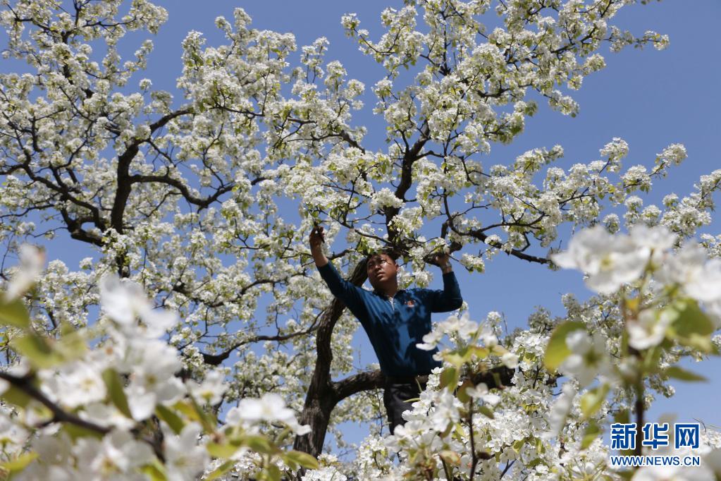 4月19日,農(nóng)民在河北省承德縣新杖子鎮(zhèn)葦子峪村梨園為梨樹疏花。