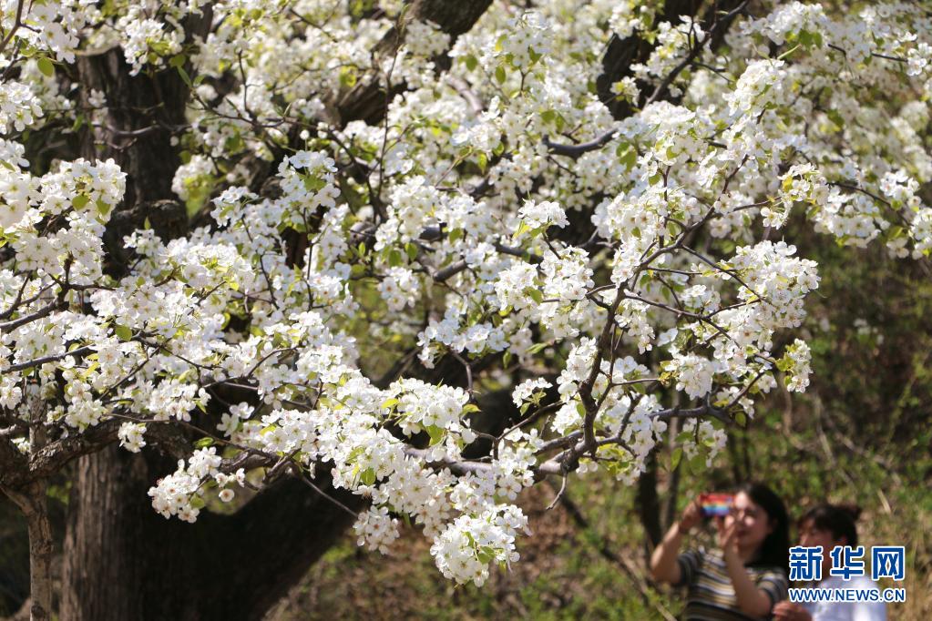 4月19日,游人在河北省承德縣新杖子鎮葦子峪村的梨園內賞花。