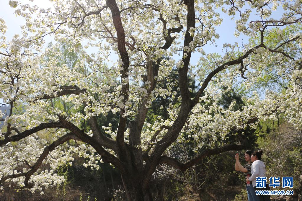 4月19日,游人在河北省承德縣新杖子鎮葦子峪村的梨園內賞花。