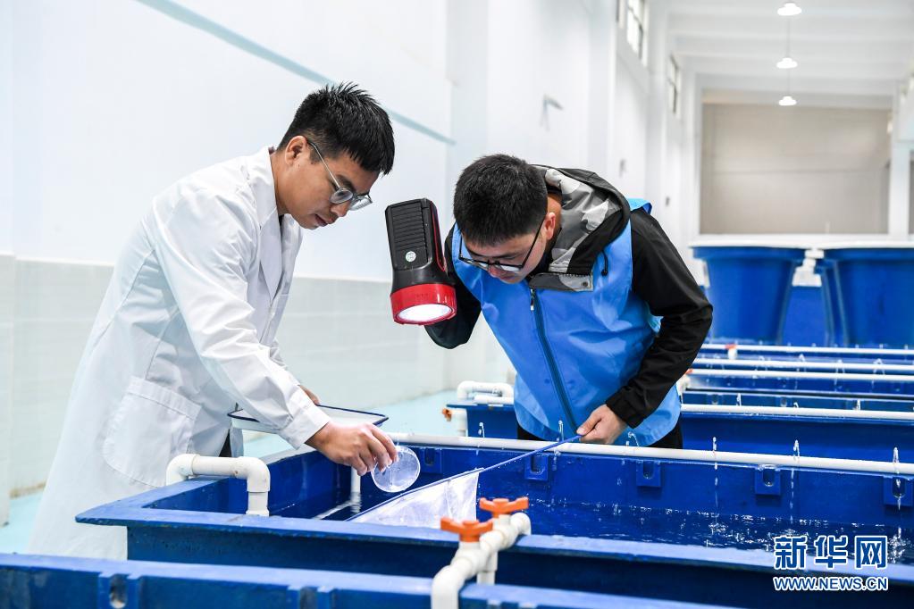 4月20日,大藤峽魚類增殖放流站的工作人員在魚苗孵化槽內采樣。