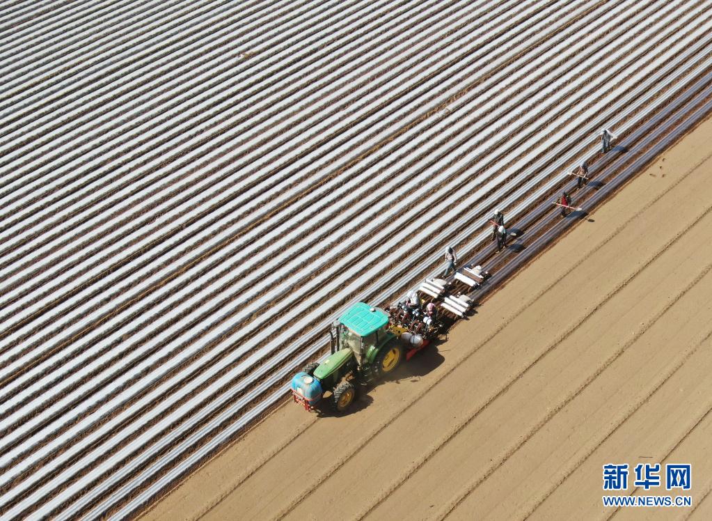4月20日,工人操作機械設備在河北省張家口市塞北管理區農業基地為剛播種的胡蘿卜覆膜(無人機照片)。