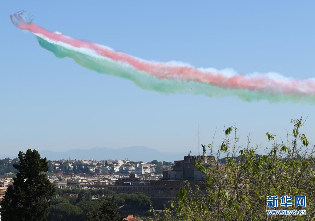 4月25日,意大利“三色箭”飛行表演隊在羅馬舉行的紀念儀式上噴出代表意大利國旗顏色的紅白綠三色煙霧。