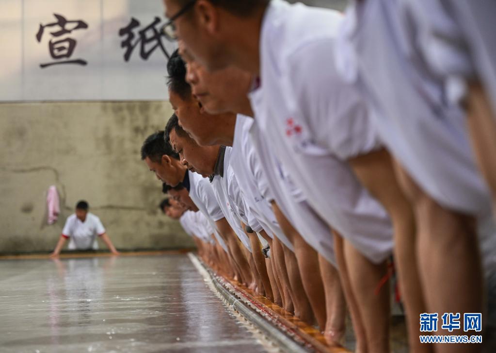 近日,在宣紙產地安徽省宣城市涇縣,“四丈宣紙”的抄制在一家紙業有限公司啟動。50余名撈紙師傅操作巨型紙簾,齊心協力,在紙槽旁進行撈紙作業。來回起落兩次,動作整齊劃一。隨后工人們將紙簾吊起放至一邊揭下,一張巨大的宣紙便撈制成功。經過曬、剪等工序后, 制成長13.2米、寬3.6米的巨型宣紙就是“四丈宣紙”。