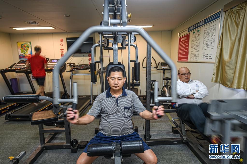 4月25日,工人在中國海油樂東15-1氣田健身房內鍛煉身體。