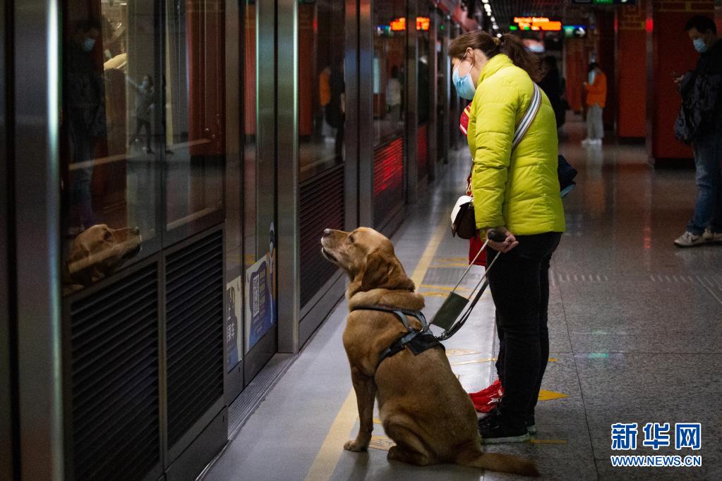 導盲犬“多多”陪伴祝愛葉在地鐵站內(nèi)準備乘坐地鐵(3月13日攝)。 新華社發(fā) (張夢 攝)