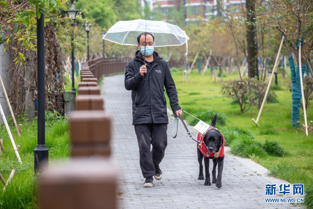 吳虎剛今年45歲,和同是盲人的妻子經營著一家盲人推拿診所。每天上班,導盲犬“C羅”都會陪伴吳虎剛從家走到診所(4月11日攝)?! ⌒氯A社發 (張夢 攝)