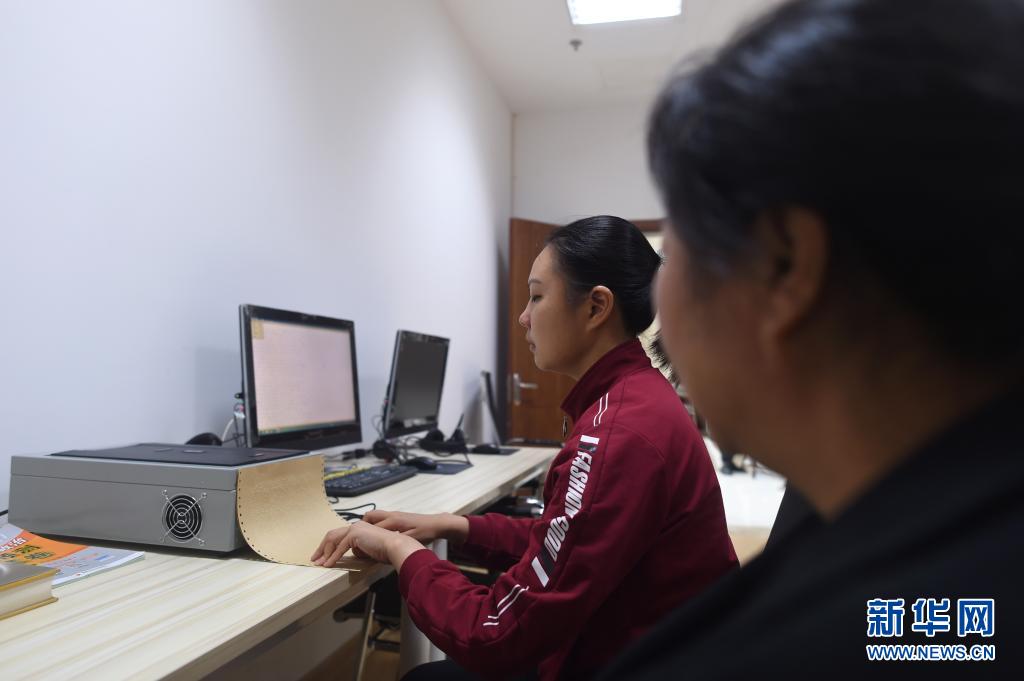 4月28日,葉景芬(前)在媽媽林鳳玉陪伴下,在龍泉市圖書館視障電子閱覽室查閱盲文資料。新華社記者 韓傳號 攝
