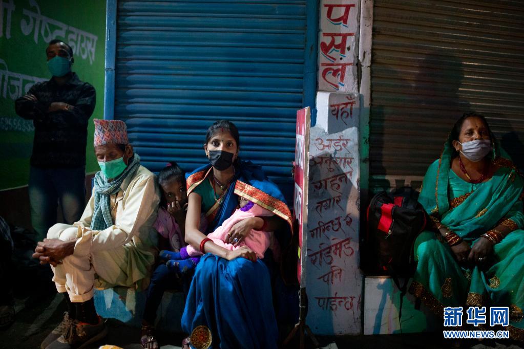 4月28日晚,人們在尼泊爾首都加德滿都的路邊等車,準備在封禁措施實施前離開加德滿都返回家鄉。