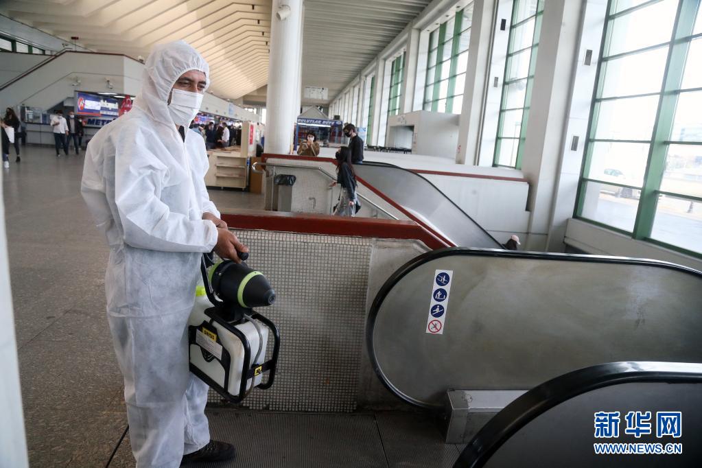 4月29日禁令實(shí)施前,一名身穿防護(hù)服的清潔工人在土耳其安卡拉的公共汽車站消毒。