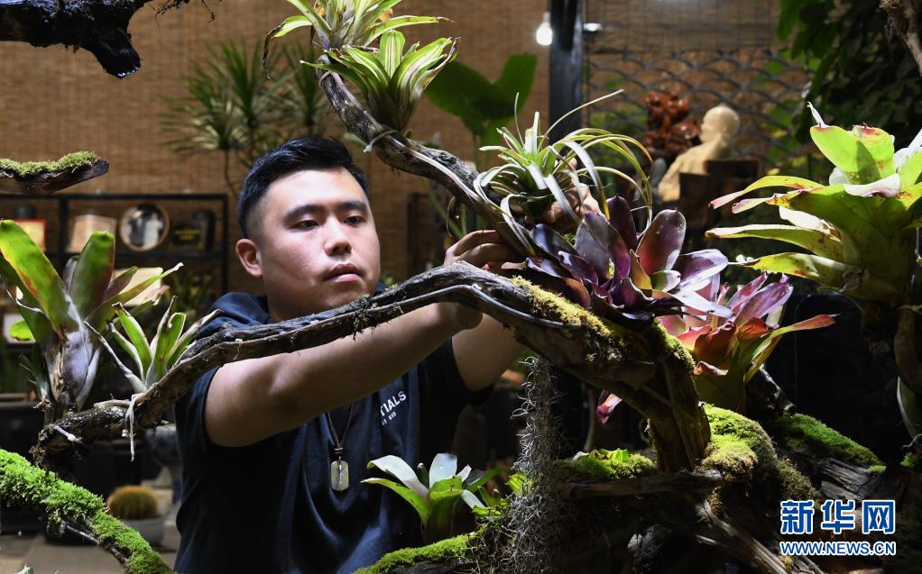5月7日,在秦嶺花世界現代農業園區,陜西芭蕉扇園林綠化有限公司總經理高杉在打理景觀生態缸。
