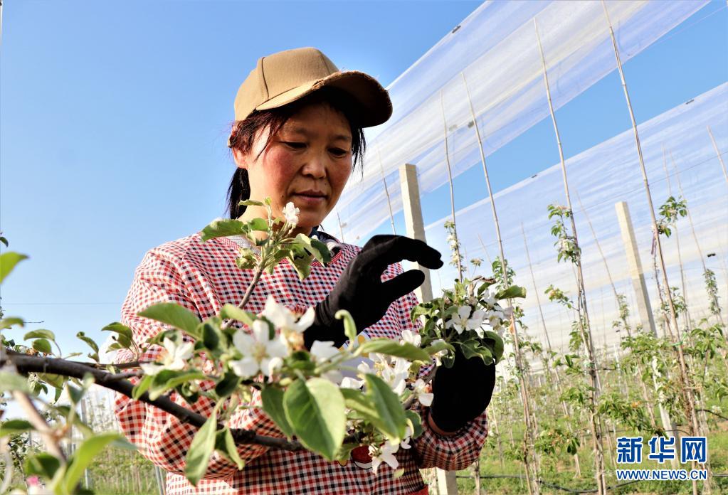 5月9日,在甘肅省平?jīng)鍪徐o寧縣城川鎮(zhèn)一蘋果有機示范園里,果農(nóng)在疏花。