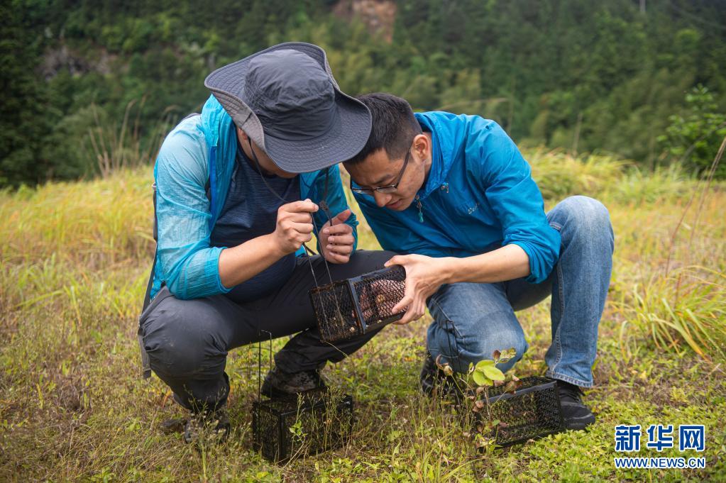 5月12日,南京環境科學研究所研究員雍凡(左)與參與此次調查的助理劉煜坤觀察誘捕籠內的動物活動痕跡。