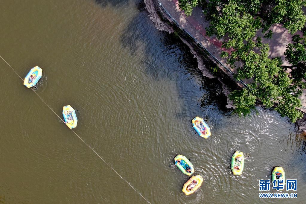 5月12日,游客在河北省邢臺市天河山景區(qū)漂流(無人機照片)。