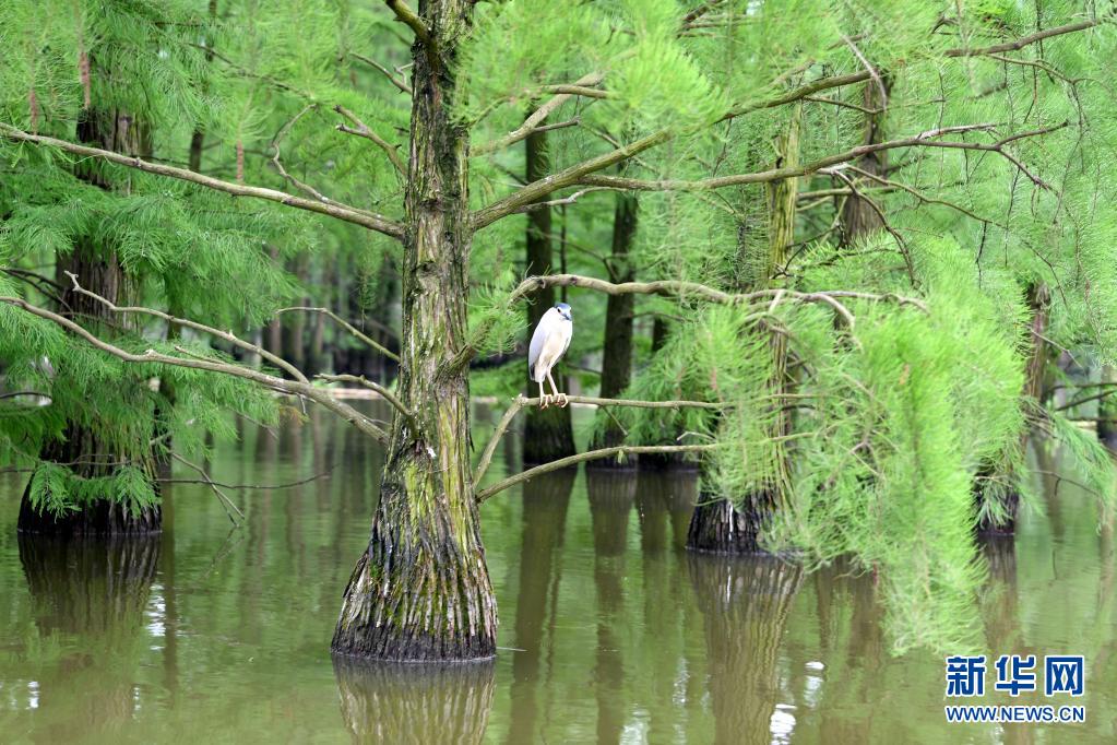 5月12日,在池杉湖國家濕地公園內,鳥兒在池杉林間休息。