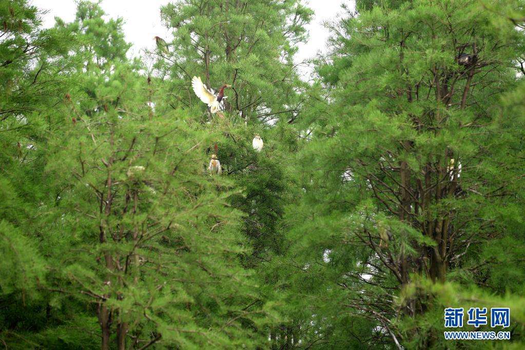 5月12日,在池杉湖國家濕地公園內,鳥兒在池杉林間休息。