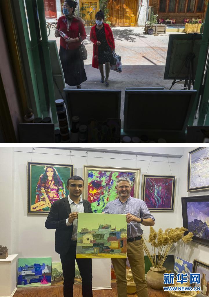 拼版照片:上圖為兩名行人在麥麥提吐?tīng)栠d江的工作室外觀看畫作(5月8日,新華社記者胡虎虎攝);下圖為“五一”期間,一名來(lái)自烏克蘭的游客(右)購(gòu)買畫作后與麥麥提吐?tīng)栠d江合影(受訪者供圖)。新華社發(fā)