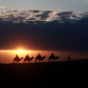 5月15日,游客騎駱駝在甘肅省敦煌市鳴沙山月牙泉景區(qū)游覽。晨光下,云彩、沙山、駝隊構(gòu)成了一幅美麗迷人的畫卷。新華社發(fā)(張曉亮 攝)