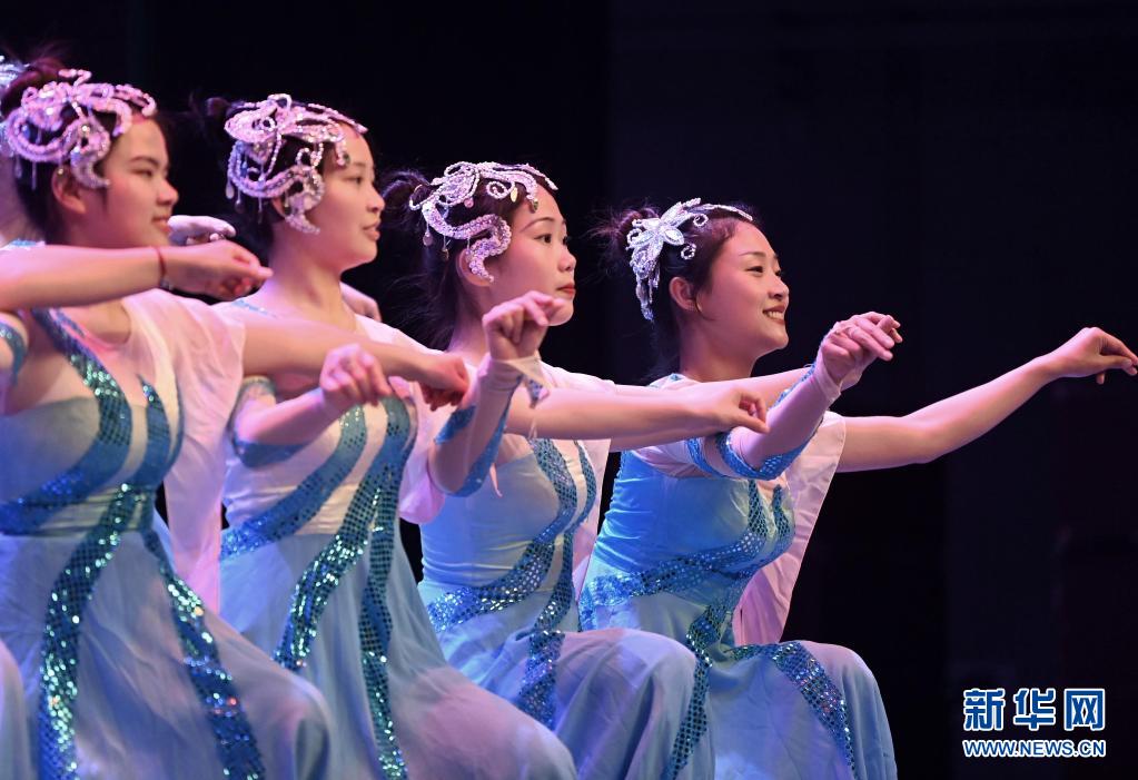 天津理工大學聾人工學院的舞蹈隊員們在學校的劇場里彩排(5月10日攝)。新華社記者 李然 攝