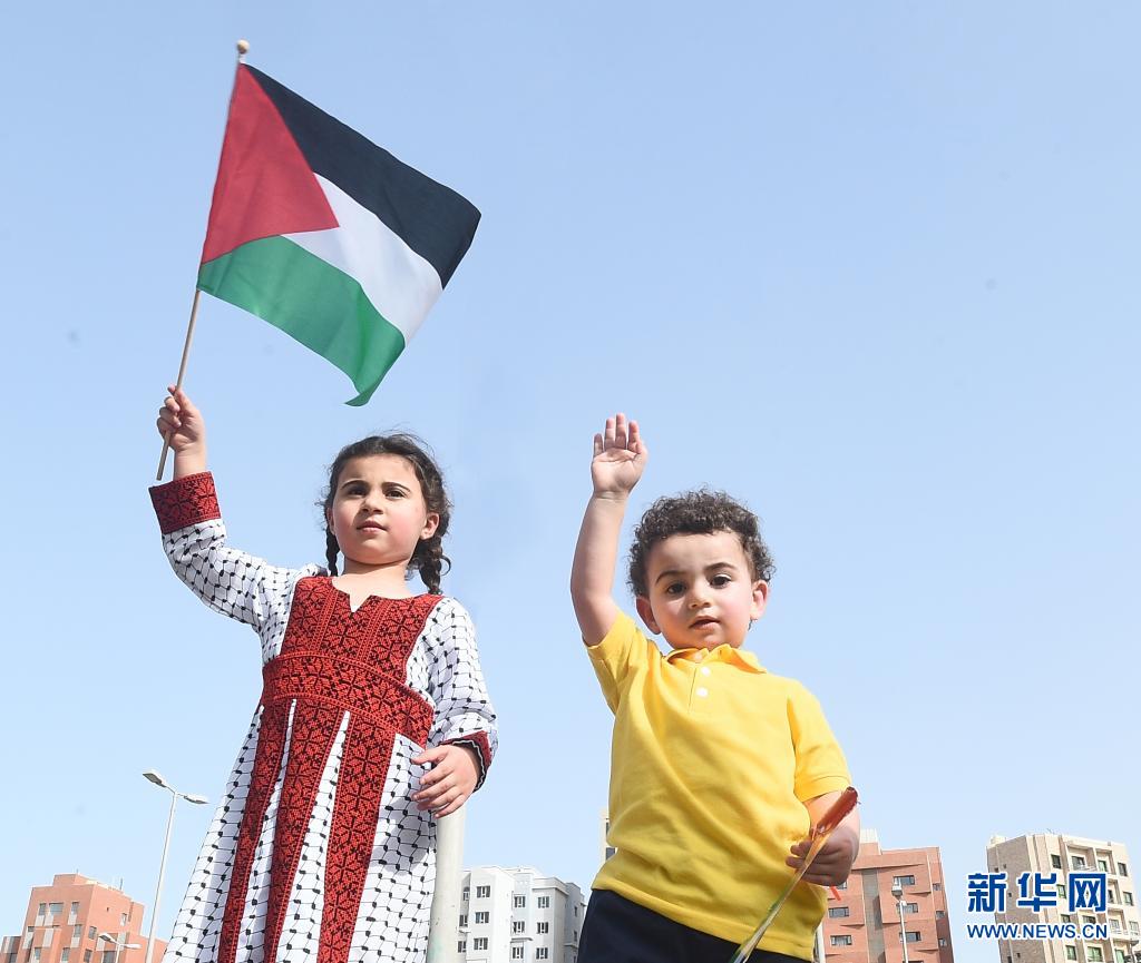 5月15日,兒童在科威特哈瓦利省參加抗議示威活動,聲援巴勒斯坦民眾。