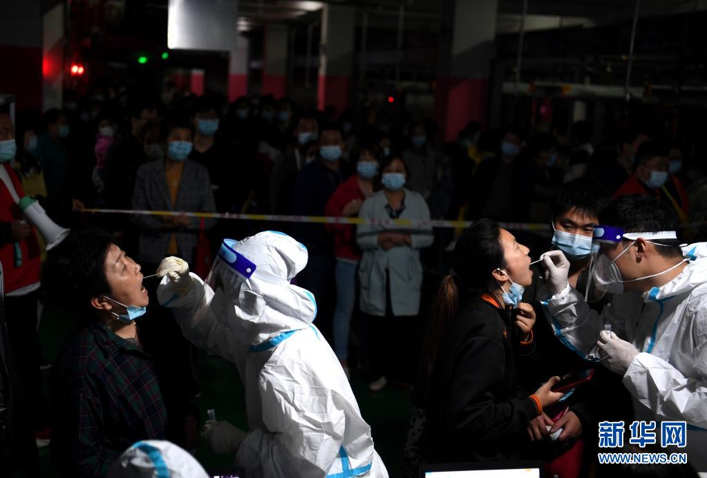 5月16日晚,在肥西縣上派鎮一小區,工作人員為居民進行核酸采樣。
