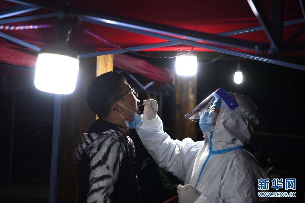 5月16日晚,在肥西縣上派鎮(zhèn)一小區(qū),工作人員為居民進(jìn)行核酸采樣。