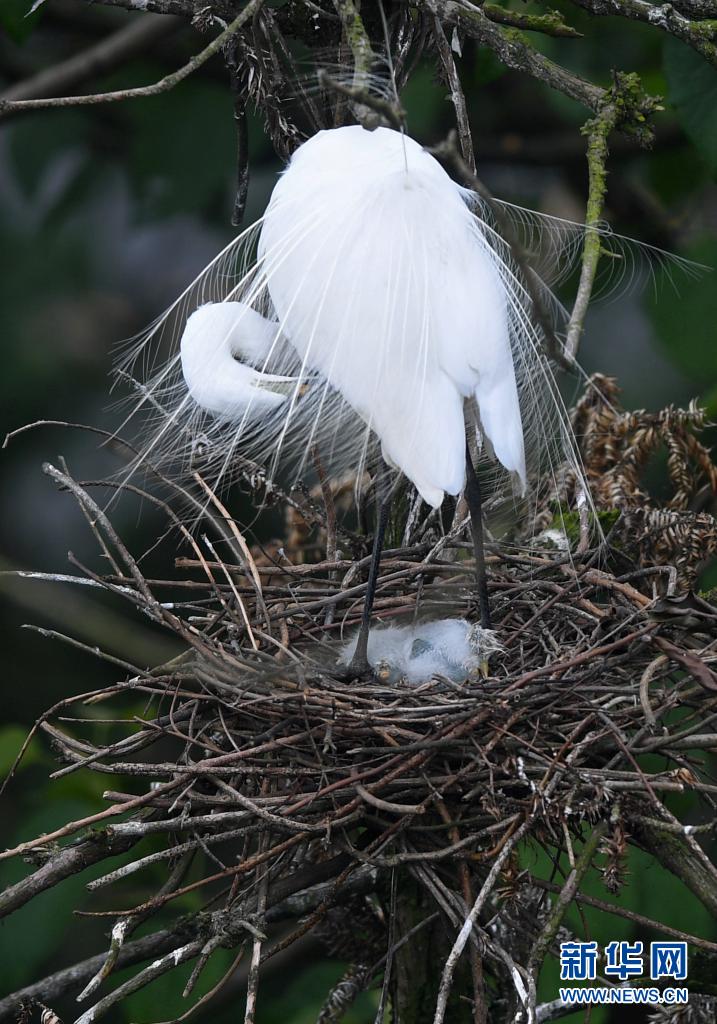 在南昌市新建區(qū)象山森林公園內,白鷺守護著雛鳥(5月18日攝)。