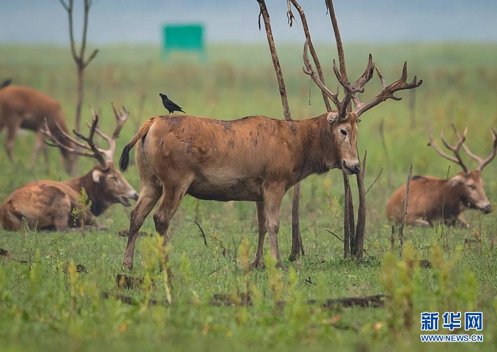 5月17日,在石首麋鹿國家級自然保護區,一只鳥在麋鹿的背上駐足。新華社記者 肖藝九 攝
