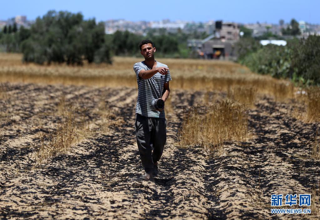 5月22日,在加沙地帶汗尤尼斯,巴勒斯坦農民走在被以色列炮擊燒焦的麥田間。新華社發(亞西爾攝)