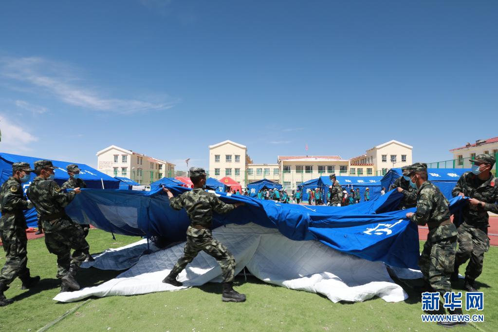 5月24日,武警青海總隊果洛支隊機動大隊官兵為花石峽鎮(zhèn)藏文中心寄宿制小學搭建帳篷教室。新華社記者 劉芳 攝