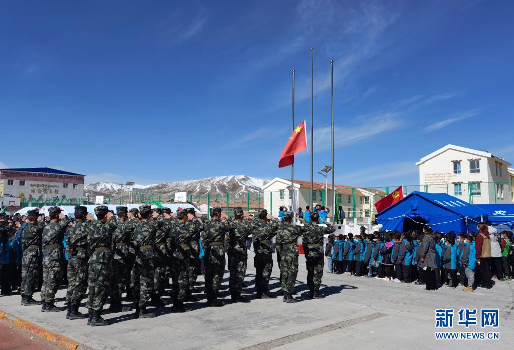 5月24日,武警青海總隊(duì)果洛支隊(duì)機(jī)動(dòng)大隊(duì)官兵與花石峽鎮(zhèn)藏文中心寄宿制小學(xué)的師生一同參加升國旗儀式。新華社發(fā)(宦爵才郎 攝)