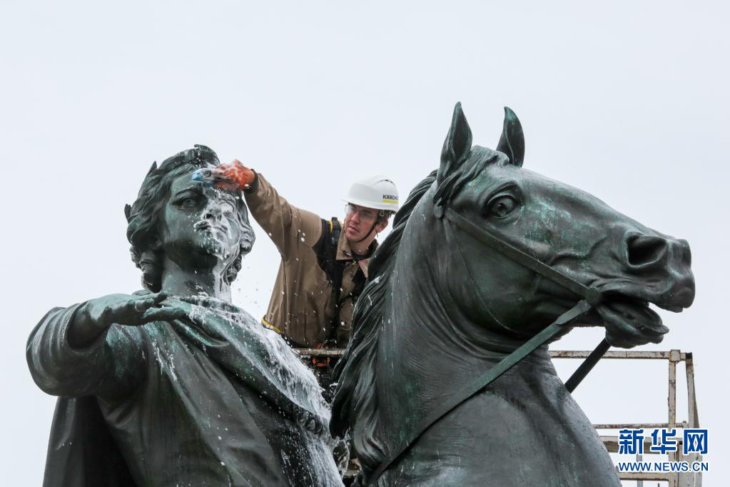 當日,圣彼得堡市政府的工作人員把彼得大帝“青銅騎士”的雕像清潔一新。圣彼得堡于1703年由彼得大帝奠基,今年的5月27日是圣彼得堡建城318周年紀念日。