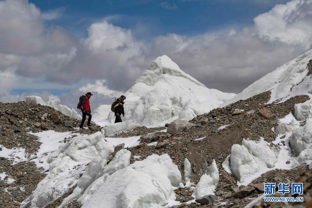 別克米爾扎·圖爾達(dá)力(右)和同伴庫爾班巴依·努爾麥麥提在適應(yīng)性練習(xí)中從冰川旁經(jīng)過(5月16日攝)。新華社記者 胡虎虎 攝
