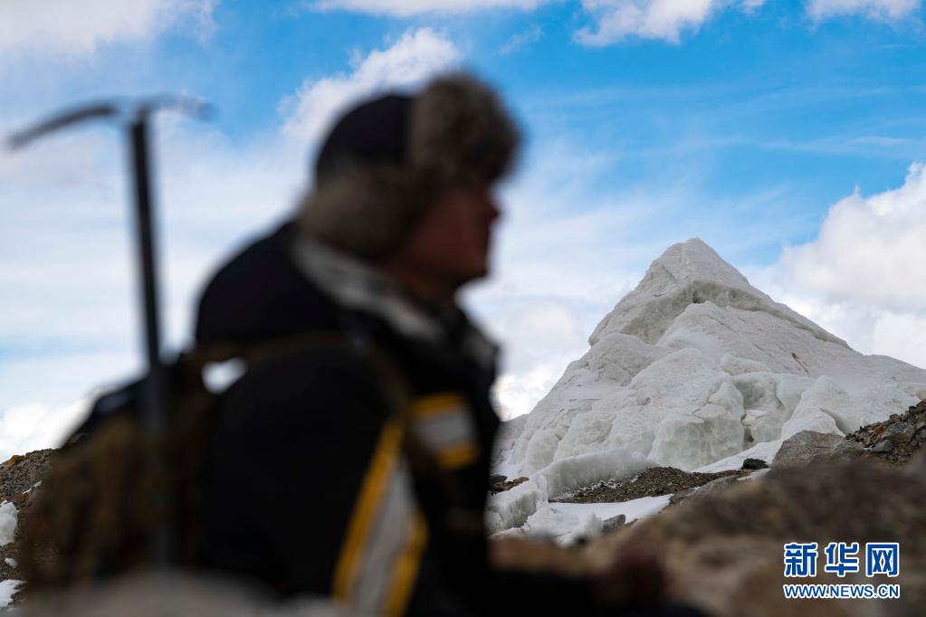 別克米爾扎·圖爾達(dá)力在適應(yīng)性練習(xí)中從冰川旁經(jīng)過(5月16日攝)。新華社記者 胡虎虎 攝
