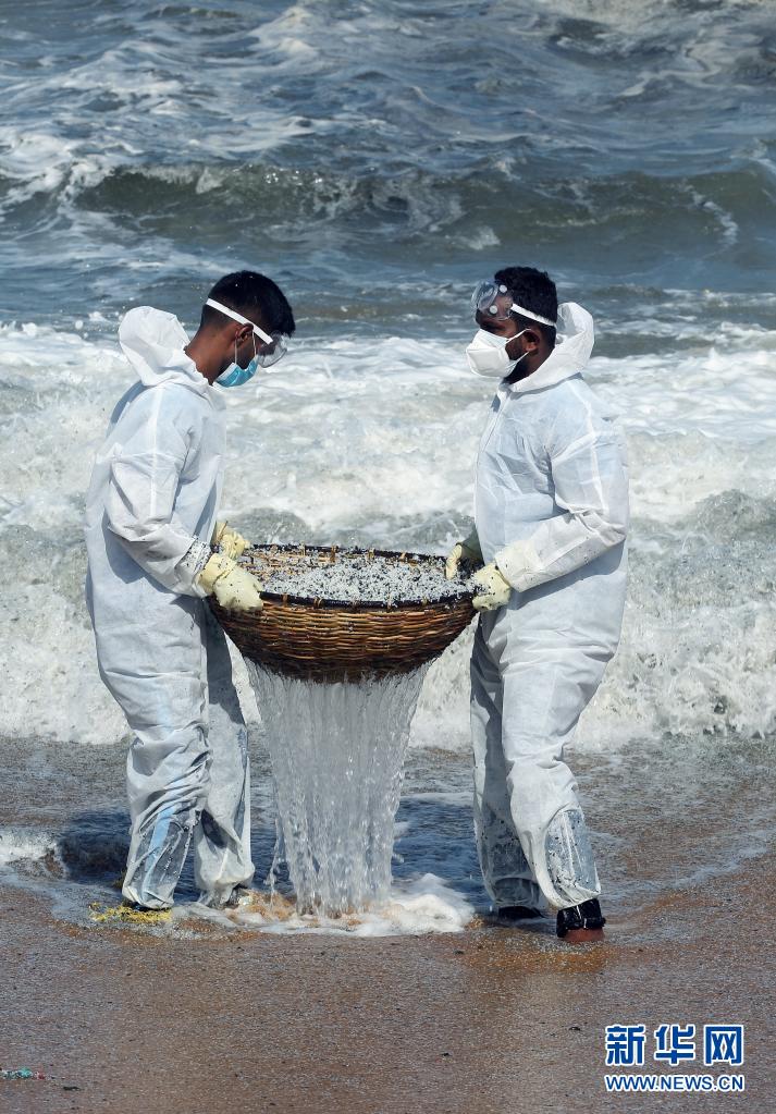 6月2日,工作人員在斯里蘭卡科倫坡一處沙灘清理貨船燃燒產(chǎn)生的廢物。