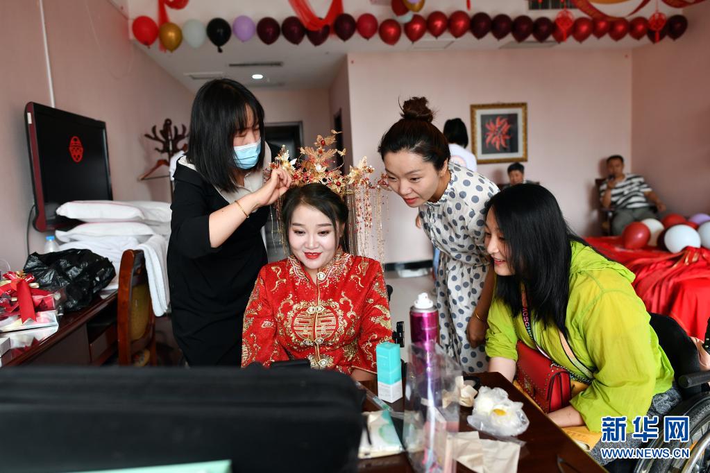 在山西省呂梁市石樓縣,化妝師(左一)和親友在給關美整理頭飾(6月15日攝)。新華社記者 詹彥 攝
