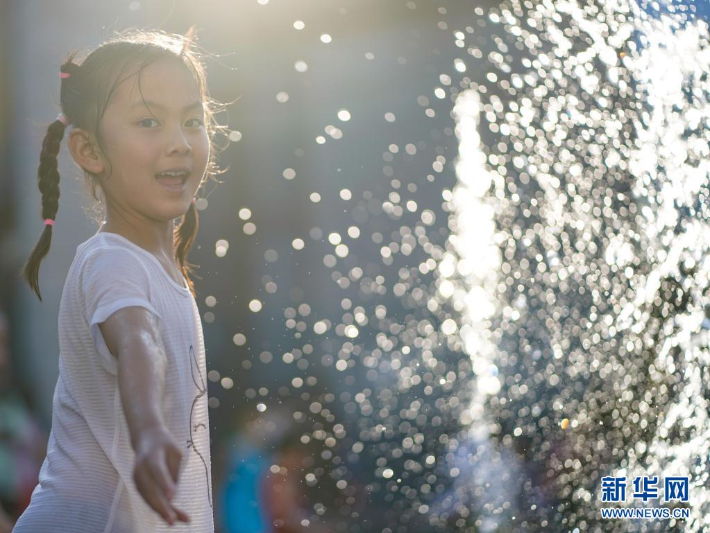 6月20日,小女孩在北京華熙LIVE·五棵松商業街區一處噴泉戲水。