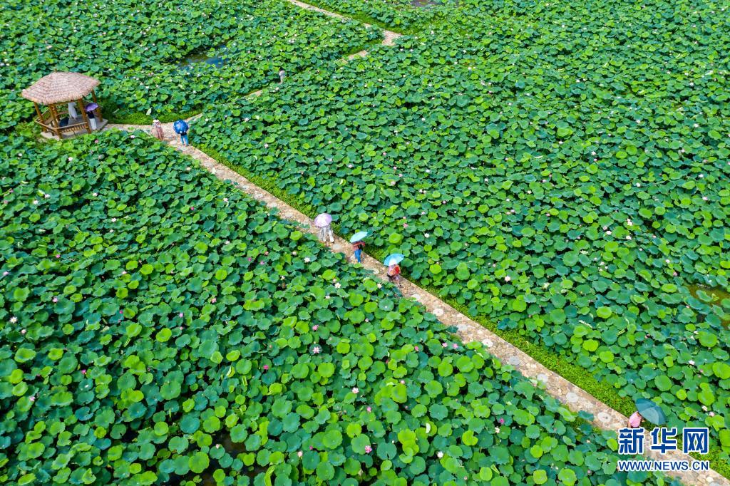 6月21日,在浙江省湖州市長(zhǎng)興縣李家巷鎮(zhèn)石泉村歷史文化古村落,游客賞荷游玩(無(wú)人機(jī)照片)。