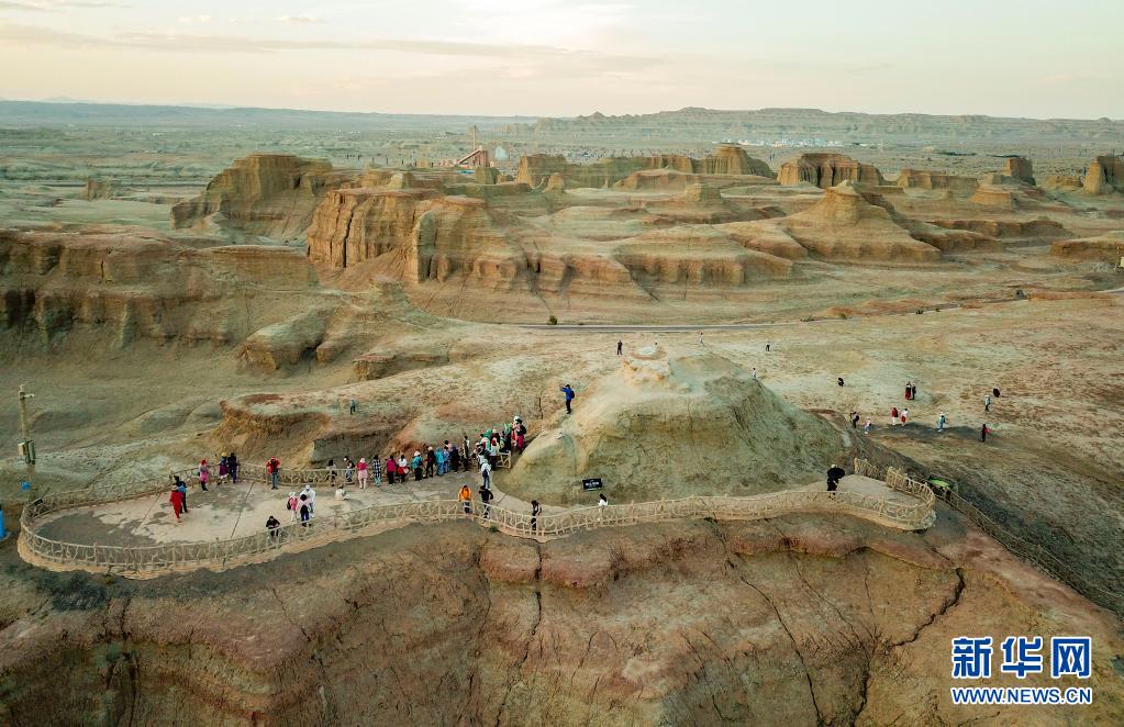 游客在新疆克拉瑪依烏爾禾世界魔鬼城景區內欣賞日落(6月21日攝,無人機照片)。
