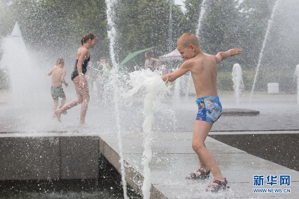 6月22日,孩子們在俄羅斯圣彼得堡300周年公園戲水消暑。