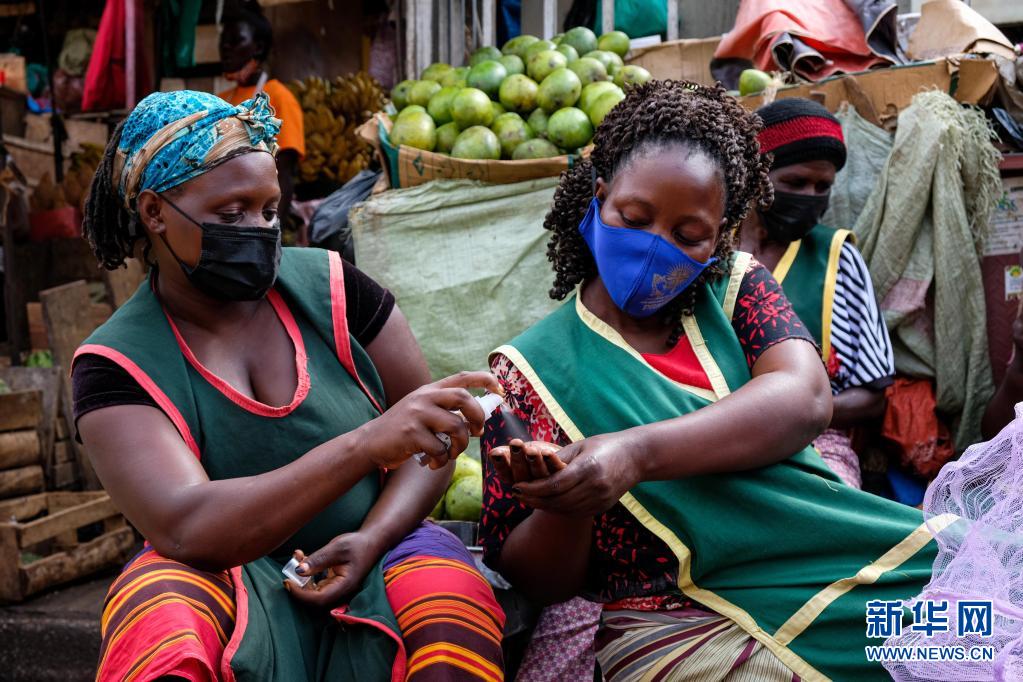 6月23日,商販在烏干達坎帕拉的納卡塞羅市場使用手部消毒液。